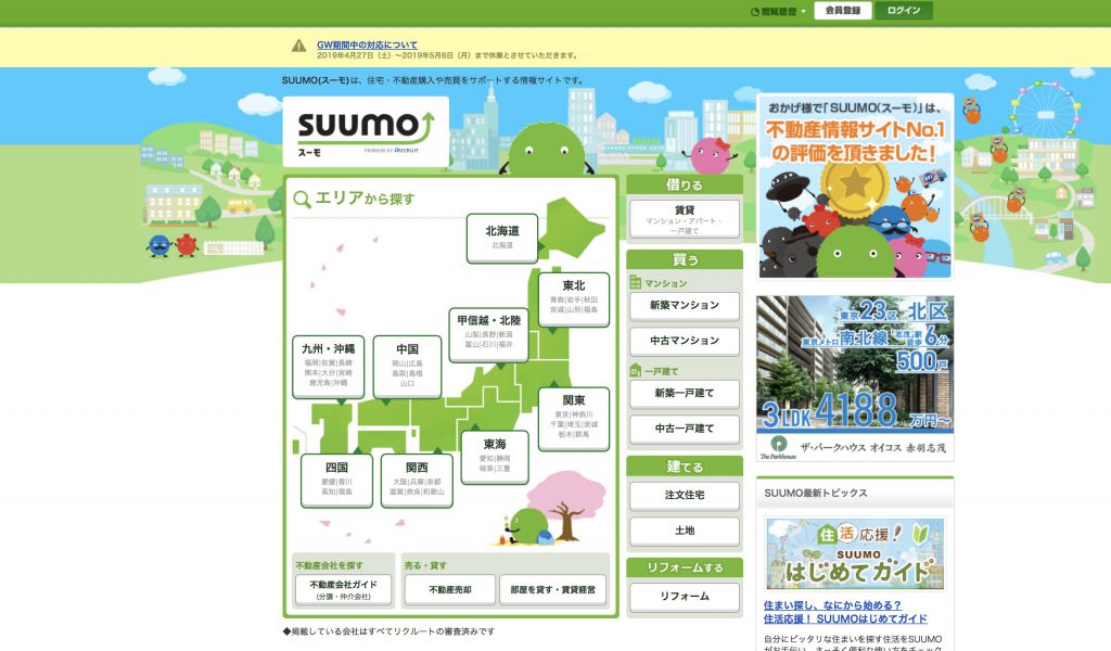 言わずとしれたSUUMO。業界専門ポータルサイトでは有名です。全国各地のマンション情報や、新築住宅、土地、リフォーム情報が幅広く掲載されています。また価格帯で絞ることもできるので、使い勝手が良いです。僕の関わった工務店のクライアントもSUUMOから集客して、かなりの利益をあげていました。