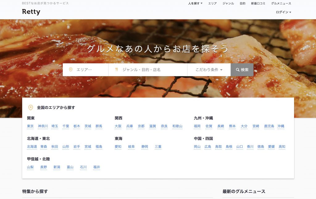 Rettyも有名なポータルサイト。地域からお店を探すことはもちろん、ランチやデート、女子会などなど目的別で選ぶことができます。飲食業界ではポータルサイトに登録しているのが結構常識になってしまっています。
