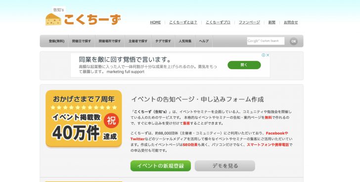 こくちーずは、セミナー・イベントを告知するポータルサイトのなかでは、かなり有名なところです。
