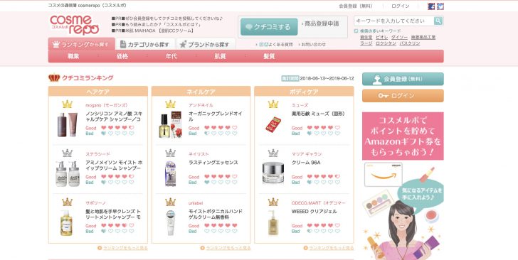 このコスメサイトは、“新着レビュー”、“みんなの口コミ”、“ランキング”がメインコンテンツ、その他に“キャンペーン”、“ポイント交換アイテム”というお得なコンテンツもあり、内容が充実しています。