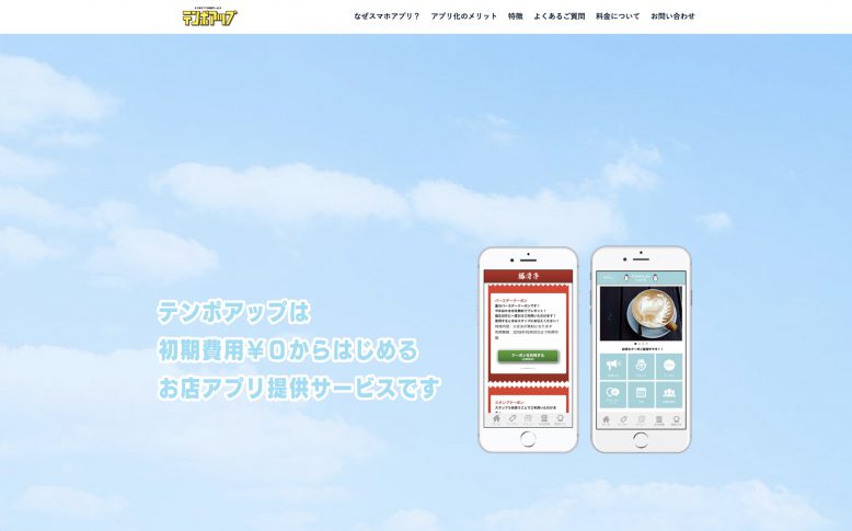 テンポアップは、お店のオリジナル店舗アプリを、“制作初期費用無料”でスタートできる、店舗向けのiPhoneアプリ・Androidアプリです。
