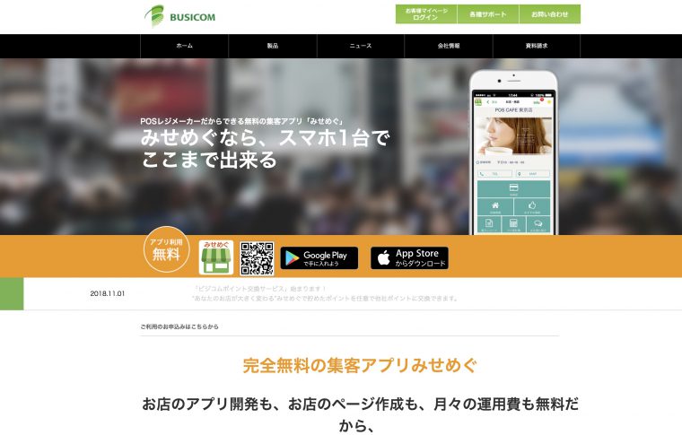 集客アプリみせめぐは、POSレジメーカーのビジコムが開発した集客アプリです。