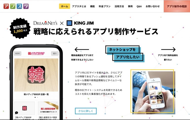 アプスタとは、ドリームネッツ社が提供している販促・集客アプリ作成ツールです。