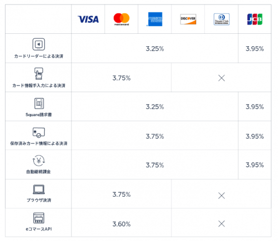 なお、上記の表画像をみていただればわかると思いますが、Squareが提供するカードリーダーでクレジットカード決済すれば、VISA・MasterCard・American Express・DISCOVER・Diners Clubは3.25の決済手数料で済ませることができます。